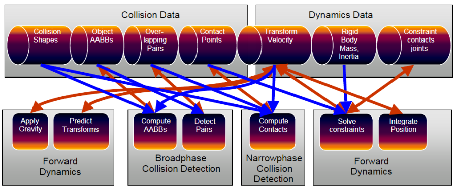 Before going into detail, the following diagram shows the most important data structures and computation stages in the Bullet physics pipeline. This pipeline is executed from left to right, starting by applying gravity, and ending by position integration, updating the world transform.